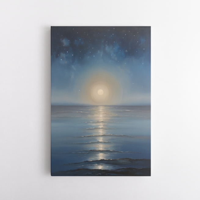 Η νυχτερινή θάλασσα αποκτά ζωή μέσα από την έντονη λάμψη του φεγγαριού. Το φως του διασχίζει τα νερά, σχηματίζοντας έναν φωτεινό διάδρομο που οδηγεί το βλέμμα στον άπειρο ουρανό. Οι αποχρώσεις του μπλε και του μαύρου συνθέτουν έναν πίνακα που προσκαλεί σε στοχασμό και ηρεμία, ενώ τα αστέρια προσθέτουν μια διάσταση απέραντης ομορφιάς.
